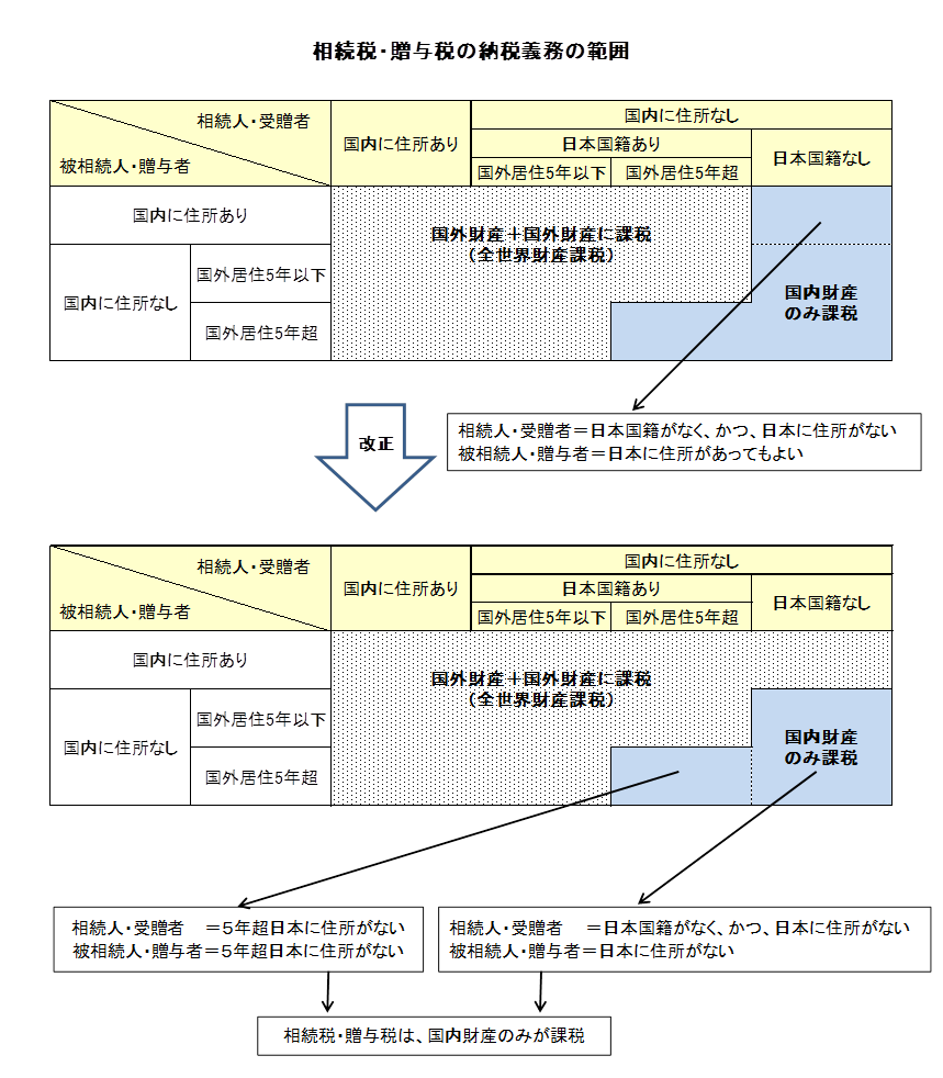 相続税・贈与税の納税義務(課税される財産)の範囲については、従来までは、住所、国籍、5年ルールによって区別されていました。つまり、財産を譲り受ける者が日本国籍の場合は、相続人・受贈者(もらう側)と被相続人・贈与者(あげる側)の双方が5年超日本に住所がないときに限り、日本国内の財産のみに対して相続税・贈与税が課され、それ以外の場合は世界中の財産に対して課税されていいました。換言すれば、財産を譲り受ける者に日本国籍がなく、かつ、国内に住所がない場合、日本国内の財産のみに対して相続税・贈与税が課され、国外財産に対しては、相続税・贈与税が課税されないことになっていました。